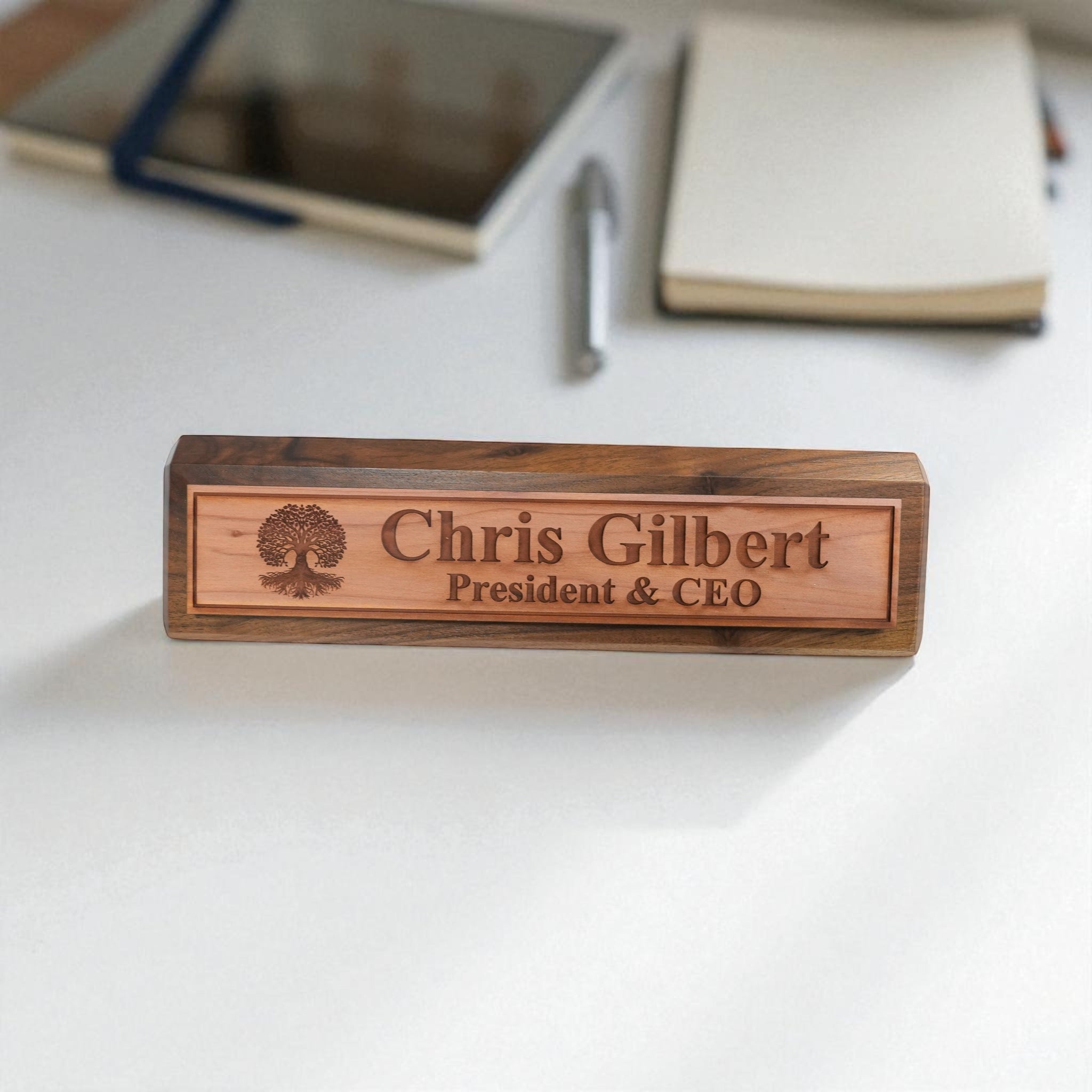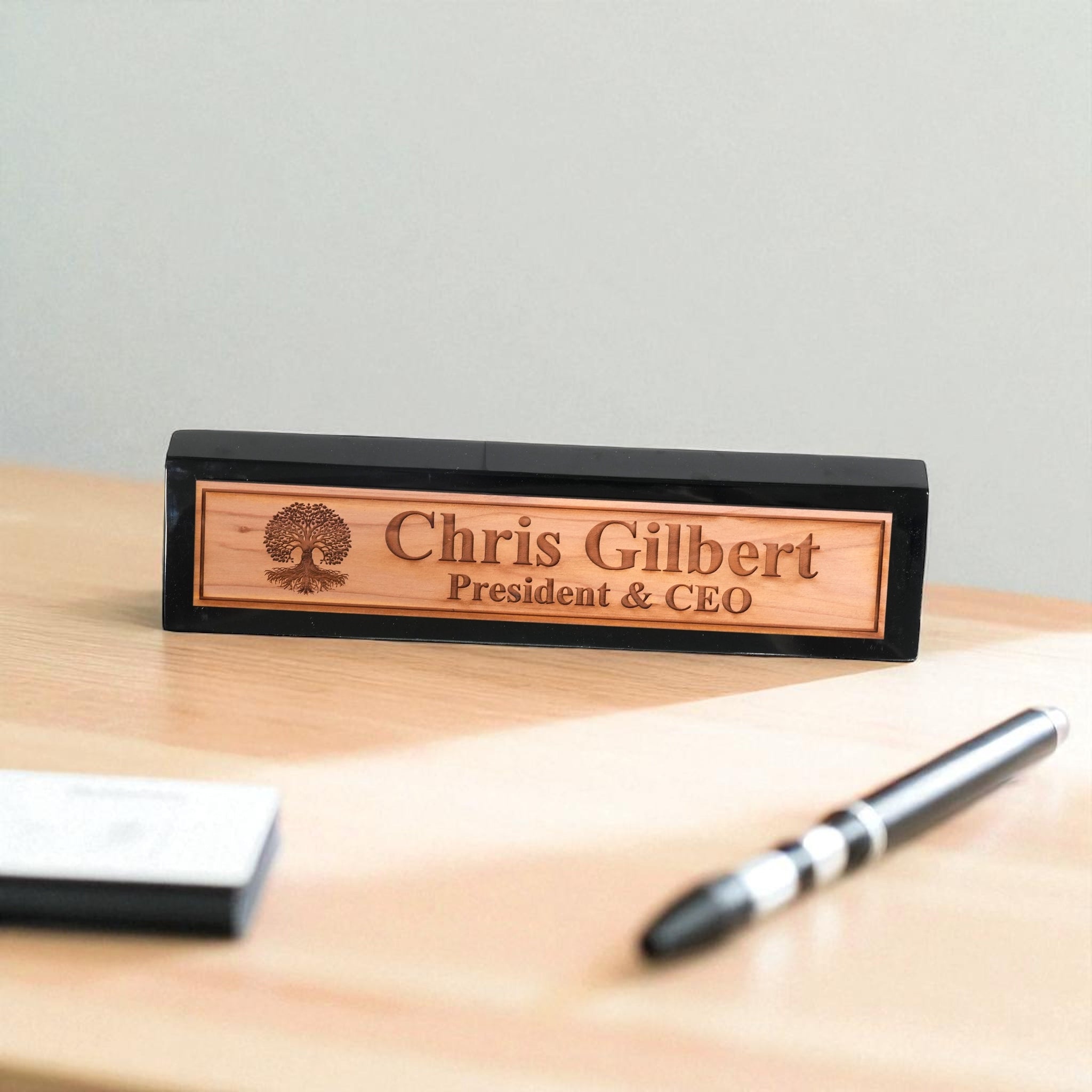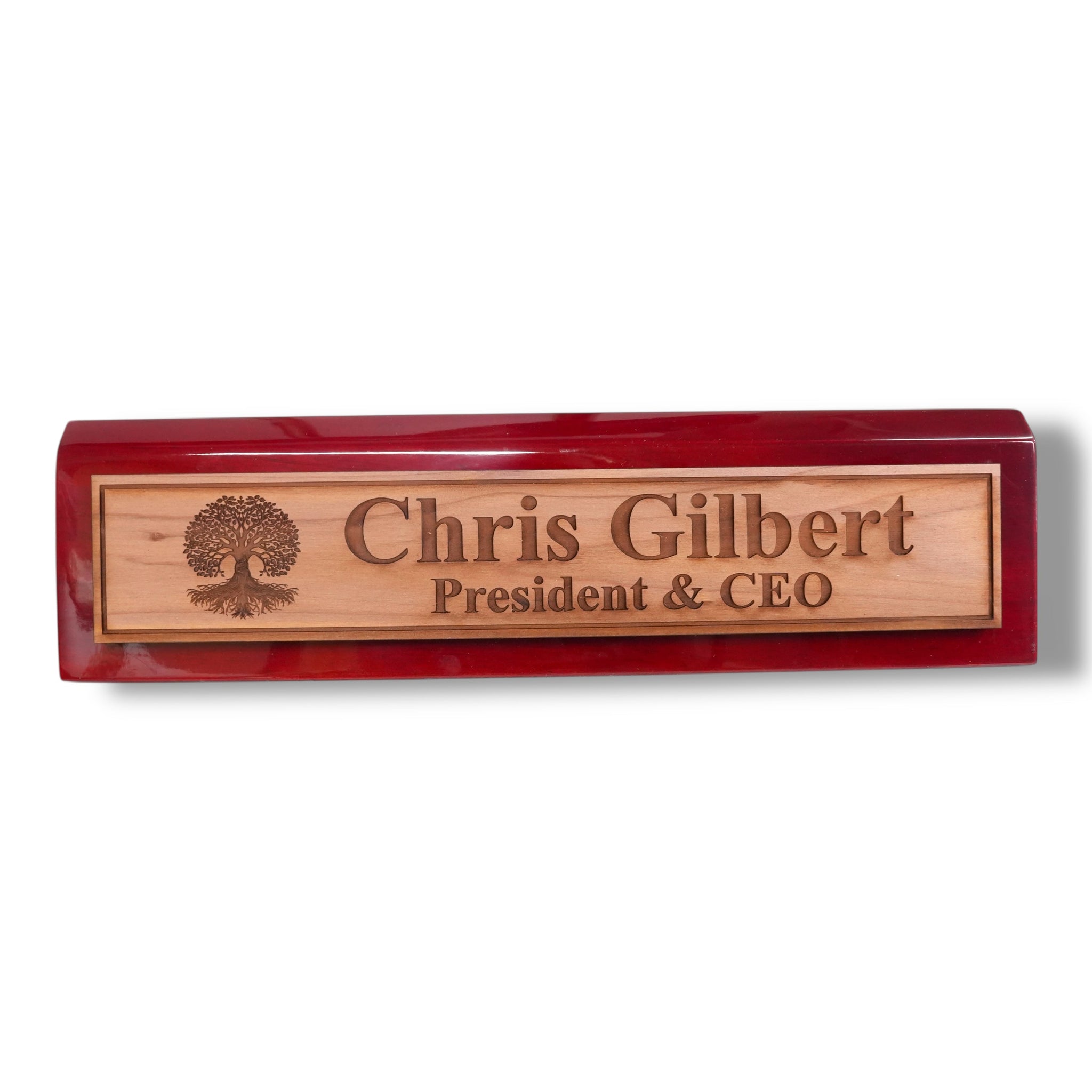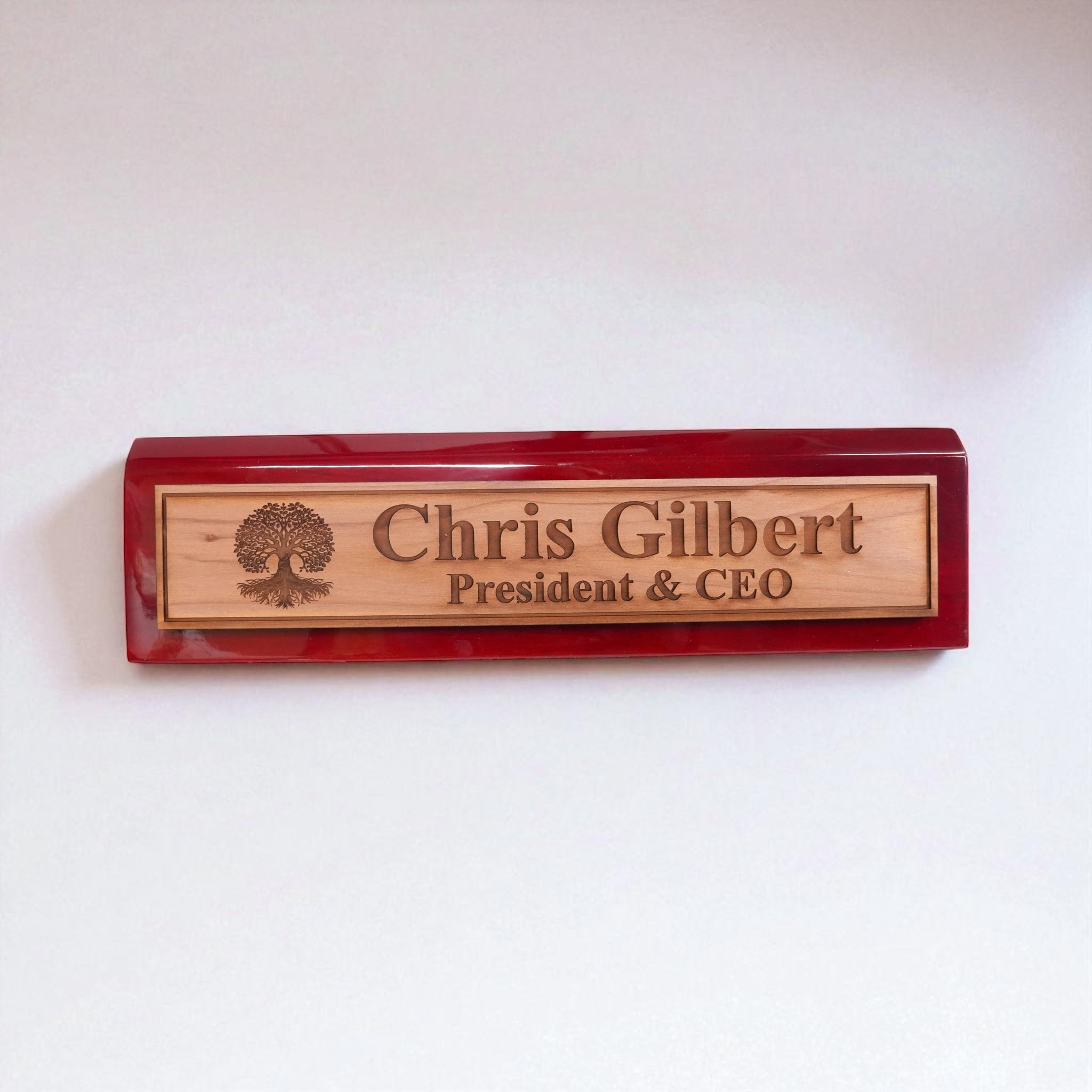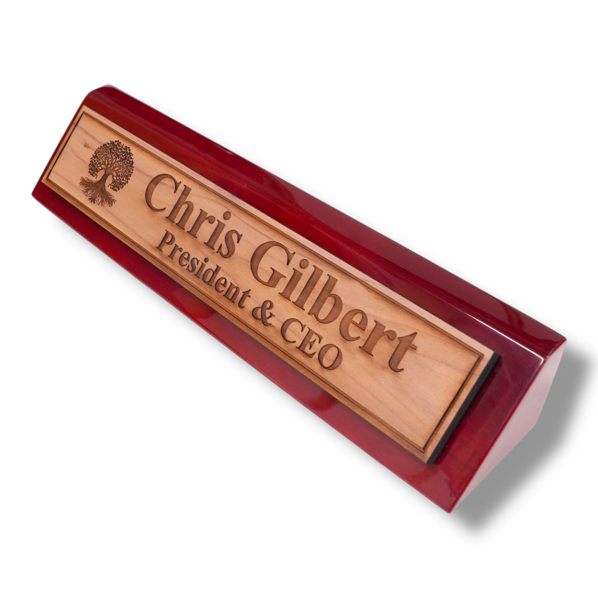 Our Desk Wedge CEDAR Name Plate combines personalized titles and styles with a sleek 11-inch length, available in black piano finish, rosewood piano finish, and solid walnut. Expertly crafted, its wedge design ensures optimal visibility and adds a sophisticated touch to any professional workspace. Made from high-quality materials, this name plate offers durability and elegance, making it an ideal choice for executives and professionals seeking a distinguished desk accessory.