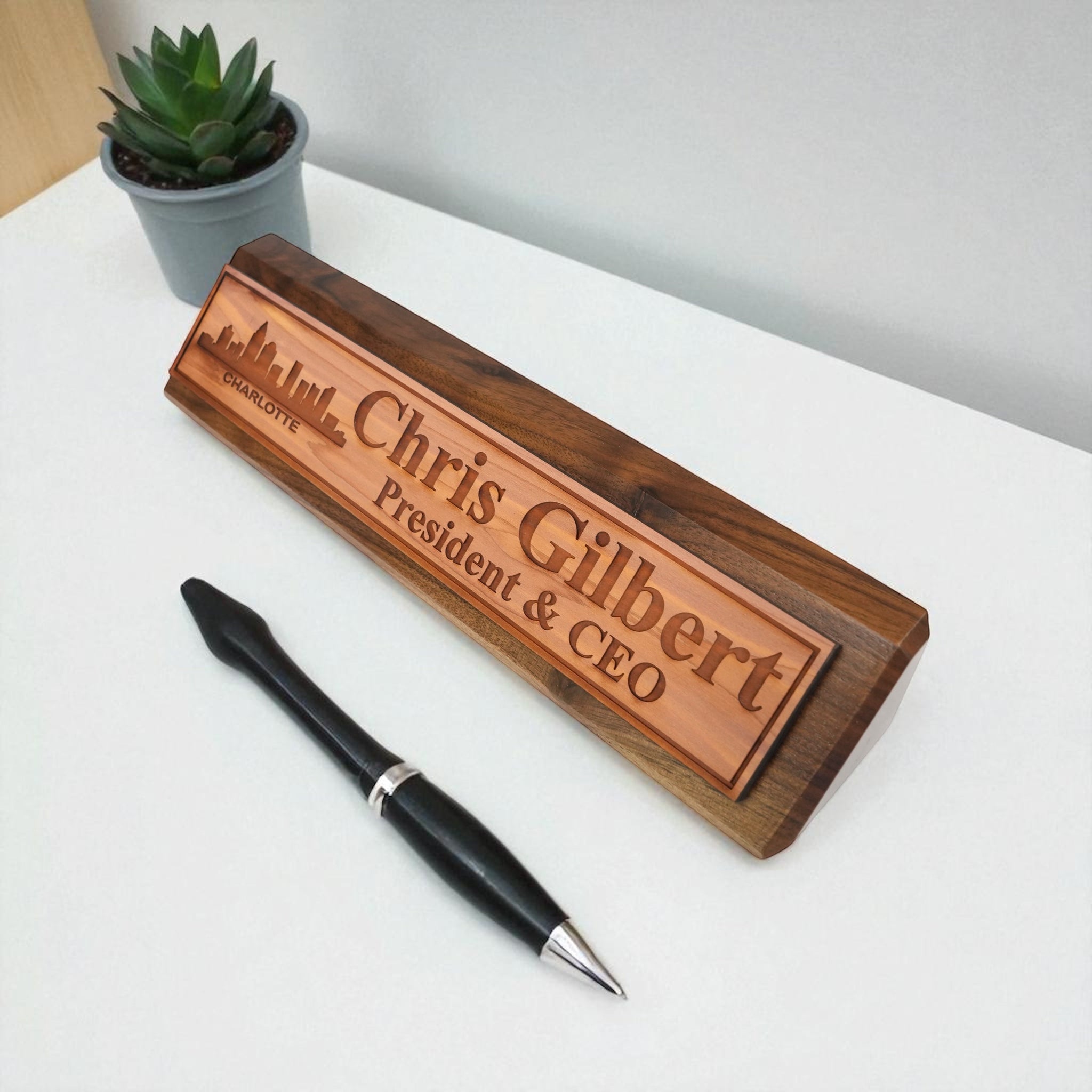 Our Desk Wedge CEDAR Name Plate combines personalized titles and styles with a sleek 11-inch length, available in black piano finish, rosewood piano finish, and solid walnut. Expertly crafted, its wedge design ensures optimal visibility and adds a sophisticated touch to any professional workspace. Made from high-quality materials, this name plate offers durability and elegance, making it an ideal choice for executives and professionals seeking a distinguished desk accessory.