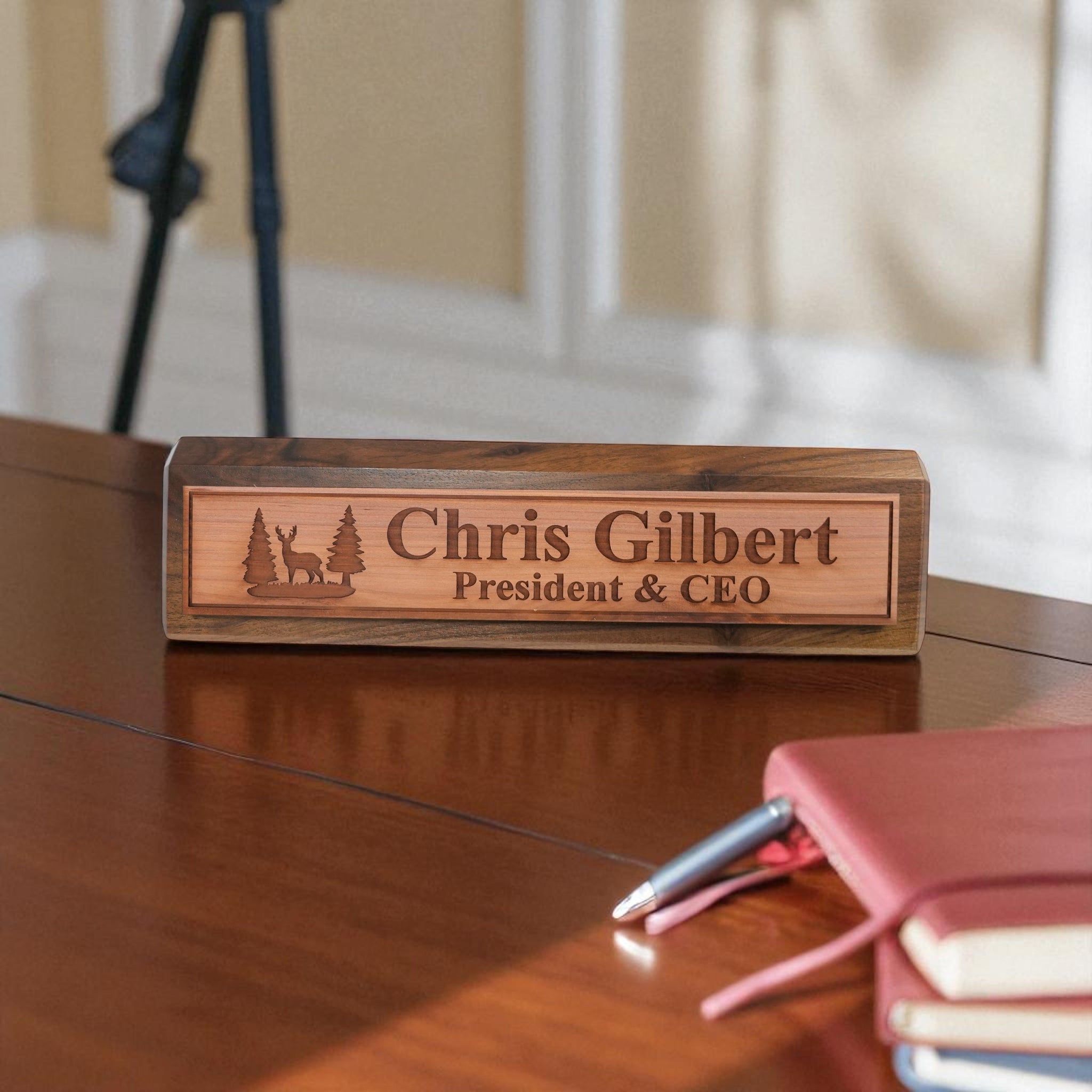 Our Desk Wedge CEDAR Name Plate combines personalized titles and styles with a sleek 11-inch length, available in black piano finish, rosewood piano finish, and solid walnut. Expertly crafted, its wedge design ensures optimal visibility and adds a sophisticated touch to any professional workspace. Made from high-quality materials, this name plate offers durability and elegance, making it an ideal choice for executives and professionals seeking a distinguished desk accessory.