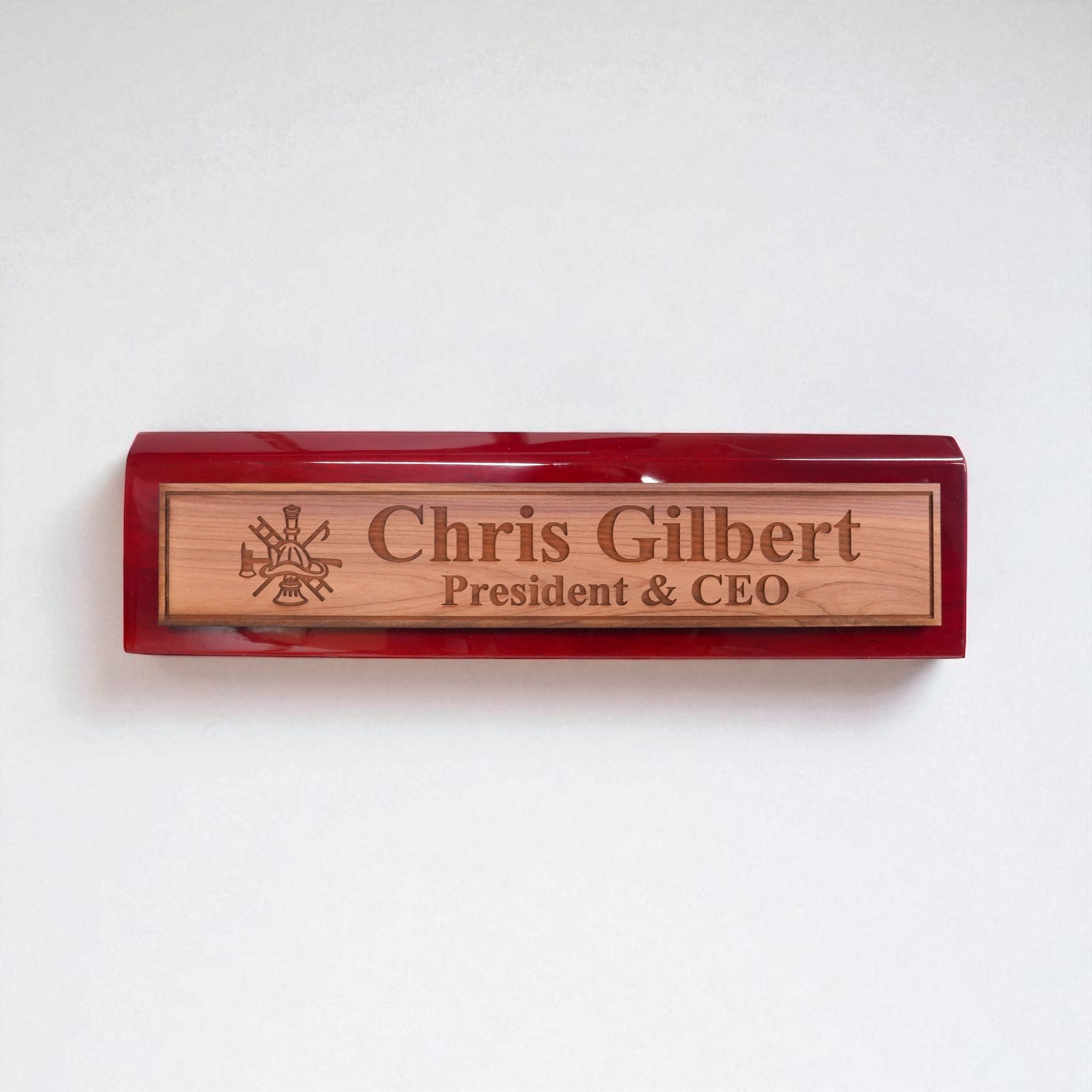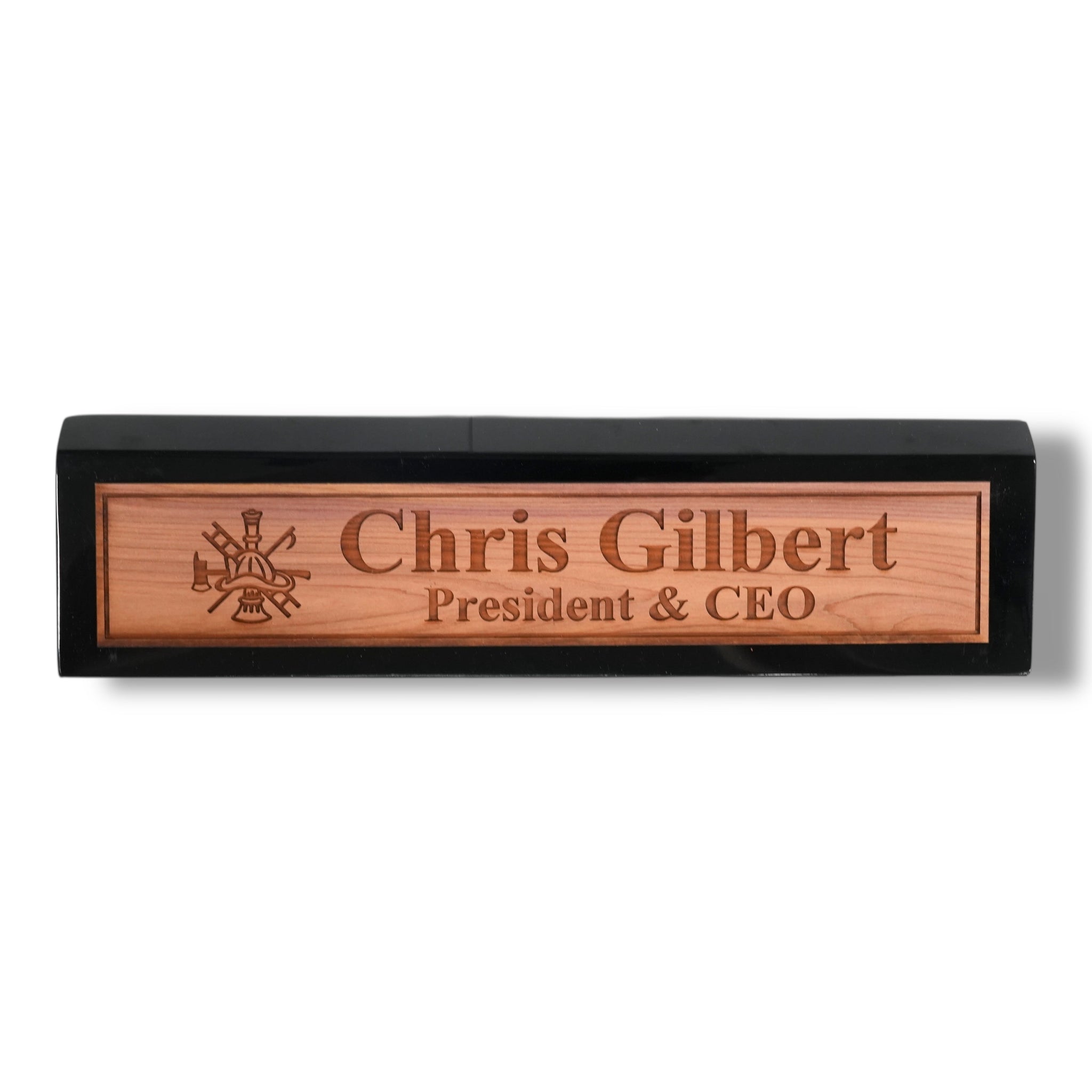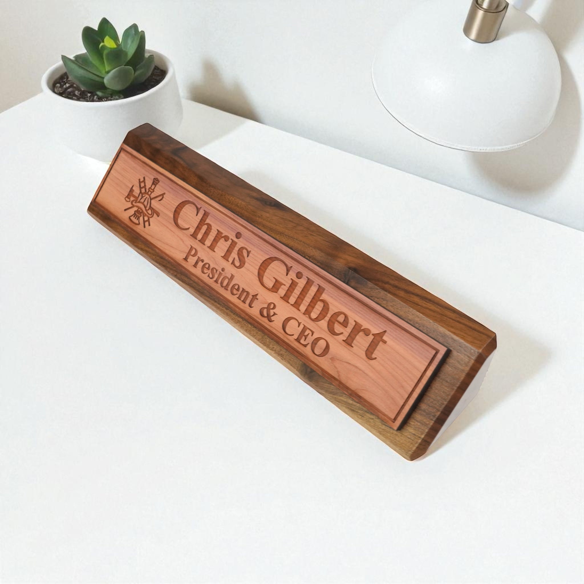 Our Desk Wedge CEDAR Name Plate combines personalized titles and styles with a sleek 11-inch length, available in black piano finish, rosewood piano finish, and solid walnut. Expertly crafted, its wedge design ensures optimal visibility and adds a sophisticated touch to any professional workspace. Made from high-quality materials, this name plate offers durability and elegance, making it an ideal choice for executives and professionals seeking a distinguished desk accessory.