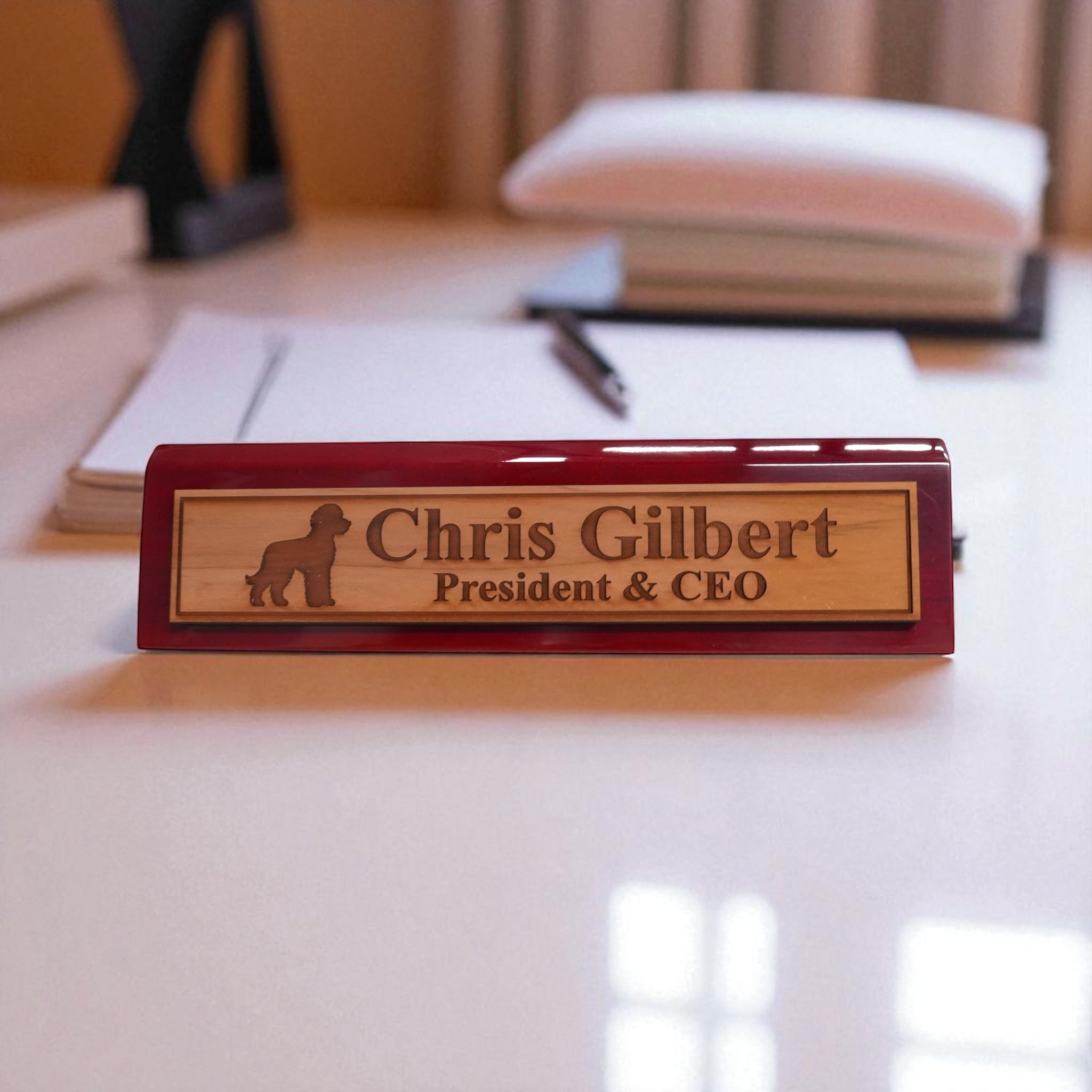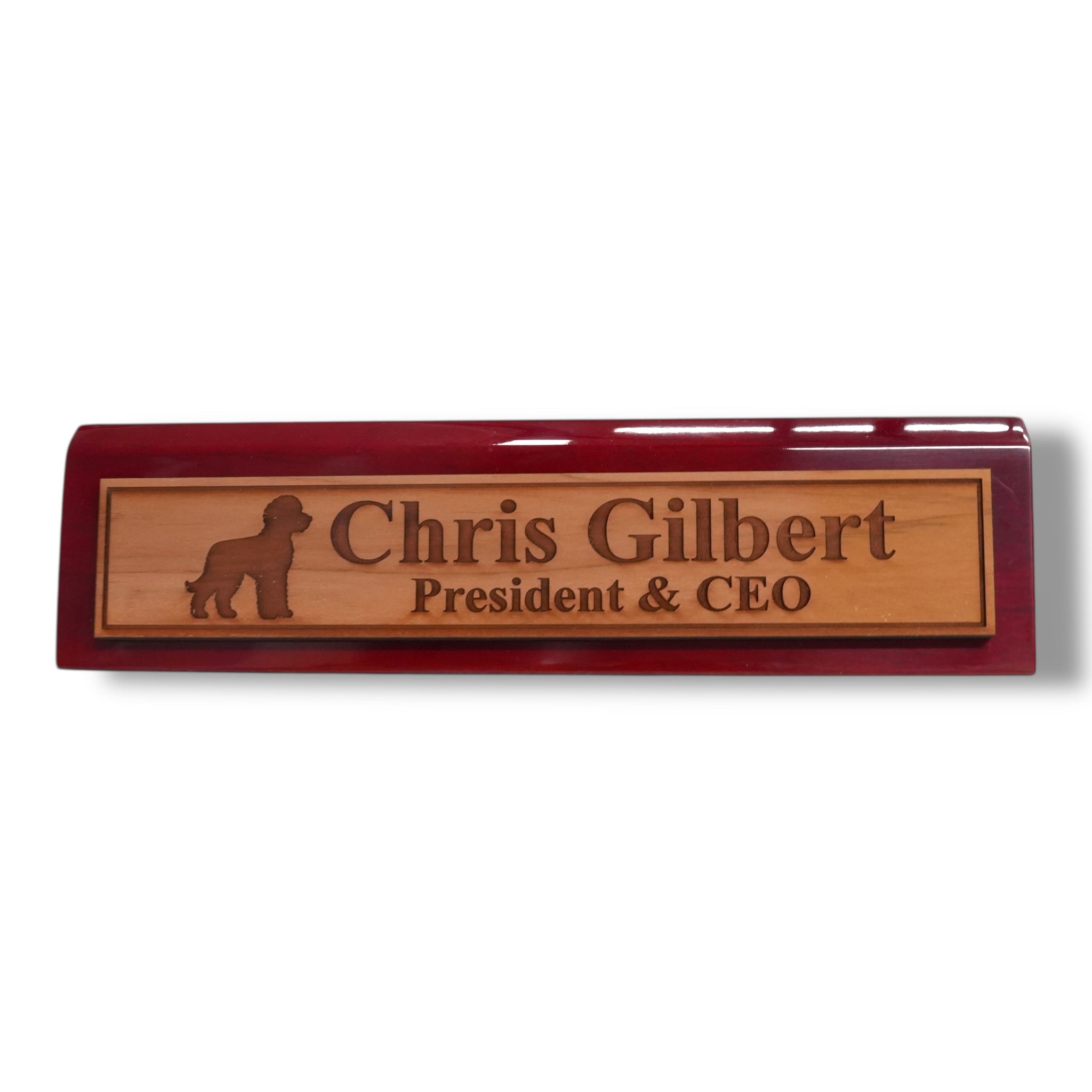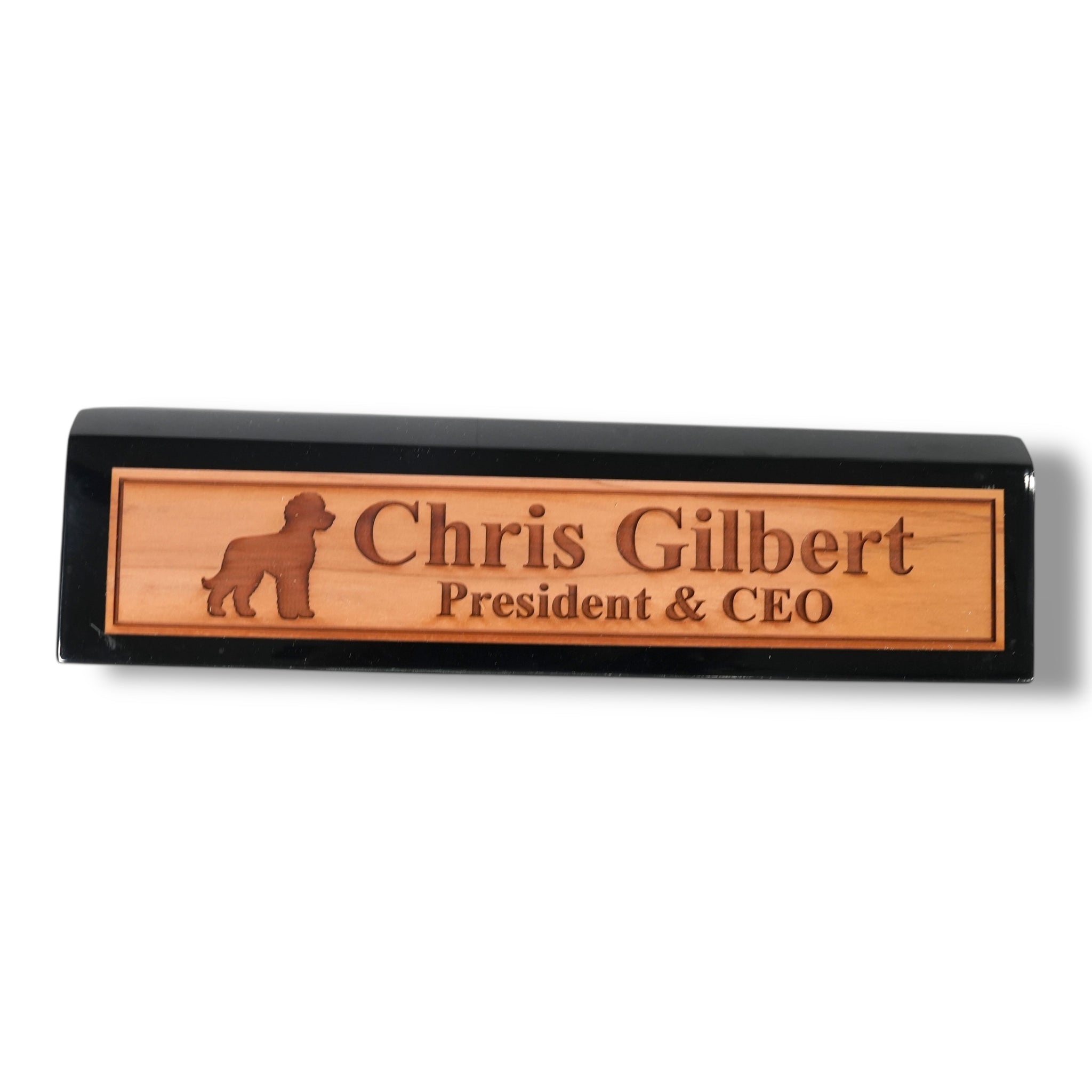 Our Desk Wedge CEDAR Name Plate combines personalized titles and styles with a sleek 11-inch length, available in black piano finish, rosewood piano finish, and solid walnut. Expertly crafted, its wedge design ensures optimal visibility and adds a sophisticated touch to any professional workspace. Made from high-quality materials, this name plate offers durability and elegance, making it an ideal choice for executives and professionals seeking a distinguished desk accessory.