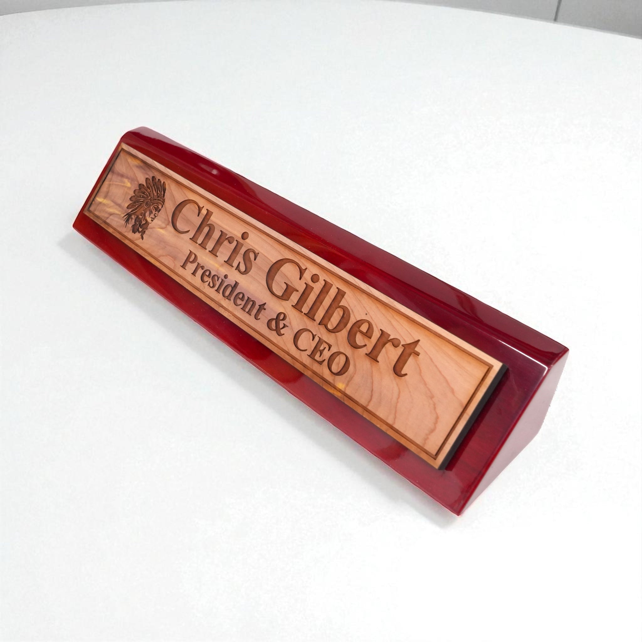 Our Desk Wedge CEDAR Name Plate combines personalized titles and styles with a sleek 11-inch length, available in black piano finish, rosewood piano finish, and solid walnut. Expertly crafted, its wedge design ensures optimal visibility and adds a sophisticated touch to any professional workspace. Made from high-quality materials, this name plate offers durability and elegance, making it an ideal choice for executives and professionals seeking a distinguished desk accessory.