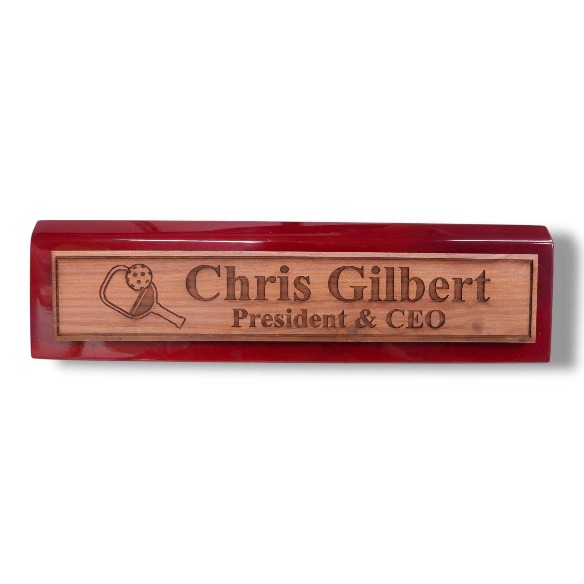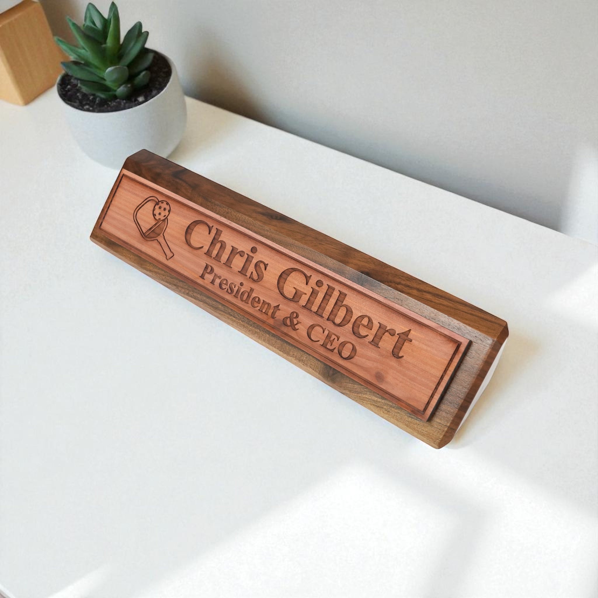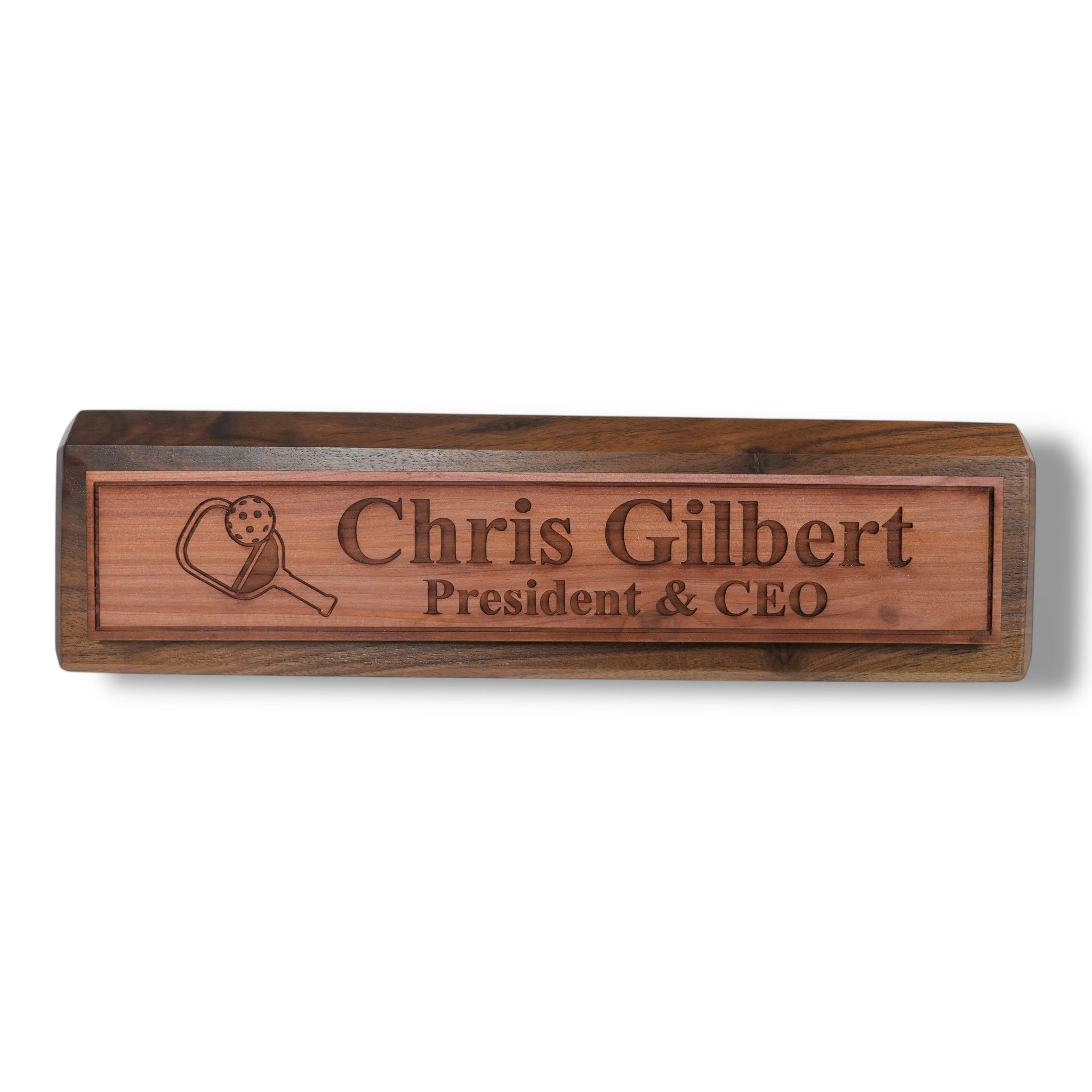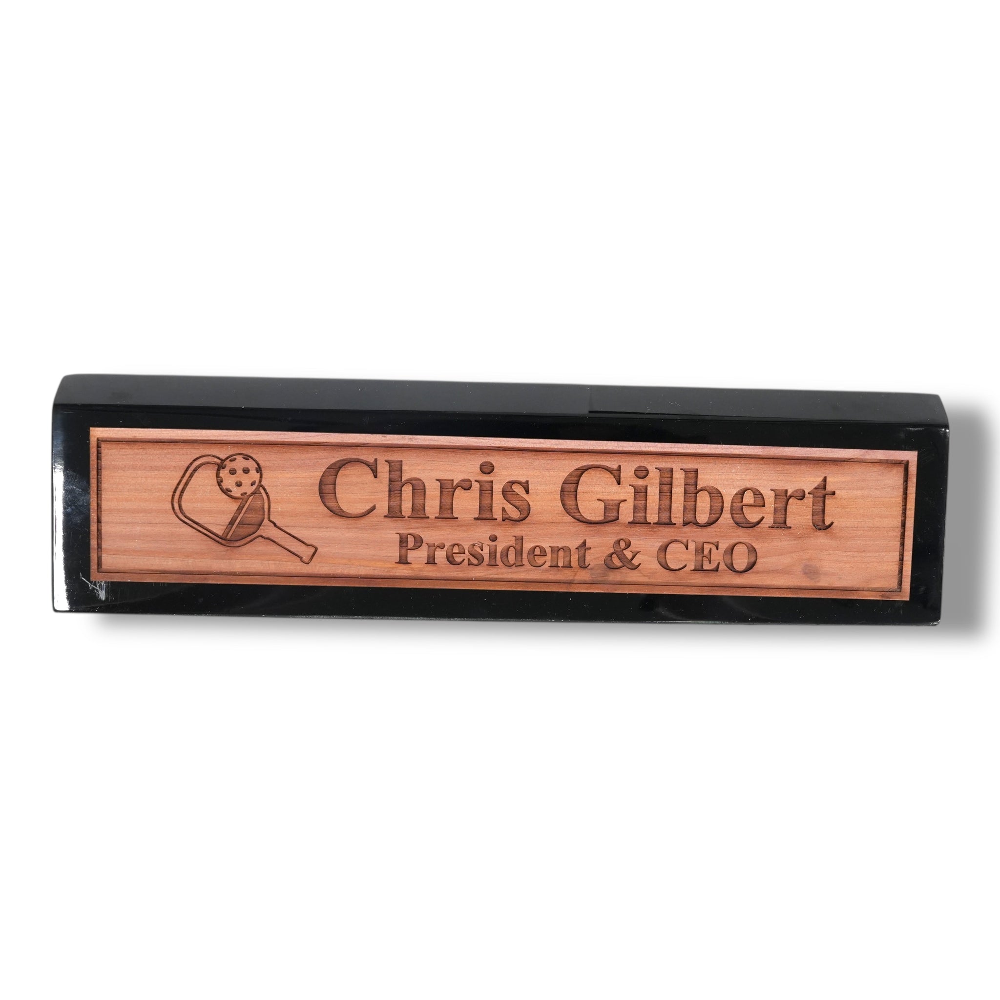 Our Desk Wedge CEDAR Name Plate combines personalized titles and styles with a sleek 11-inch length, available in black piano finish, rosewood piano finish, and solid walnut. Expertly crafted, its wedge design ensures optimal visibility and adds a sophisticated touch to any professional workspace. Made from high-quality materials, this name plate offers durability and elegance, making it an ideal choice for executives and professionals seeking a distinguished desk accessory.