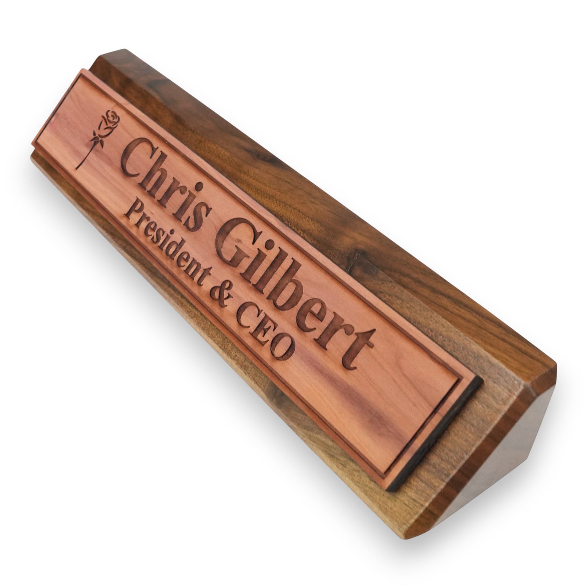 Our Desk Wedge CEDAR Name Plate combines personalized titles and styles with a sleek 11-inch length, available in black piano finish, rosewood piano finish, and solid walnut. Expertly crafted, its wedge design ensures optimal visibility and adds a sophisticated touch to any professional workspace. Made from high-quality materials, this name plate offers durability and elegance, making it an ideal choice for executives and professionals seeking a distinguished desk accessory.