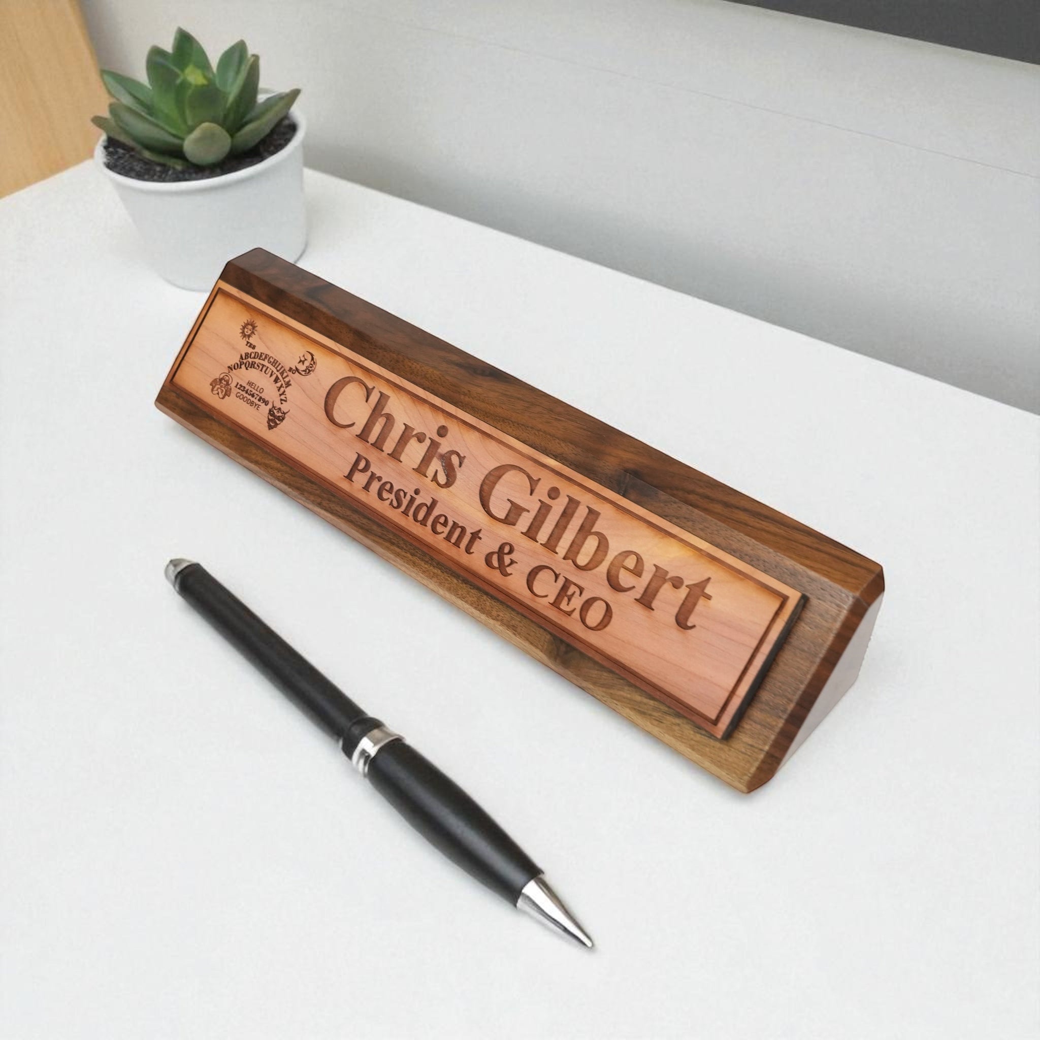 Our Desk Wedge CEDAR Name Plate combines personalized titles and styles with a sleek 11-inch length, available in black piano finish, rosewood piano finish, and solid walnut. Expertly crafted, its wedge design ensures optimal visibility and adds a sophisticated touch to any professional workspace. Made from high-quality materials, this name plate offers durability and elegance, making it an ideal choice for executives and professionals seeking a distinguished desk accessory.