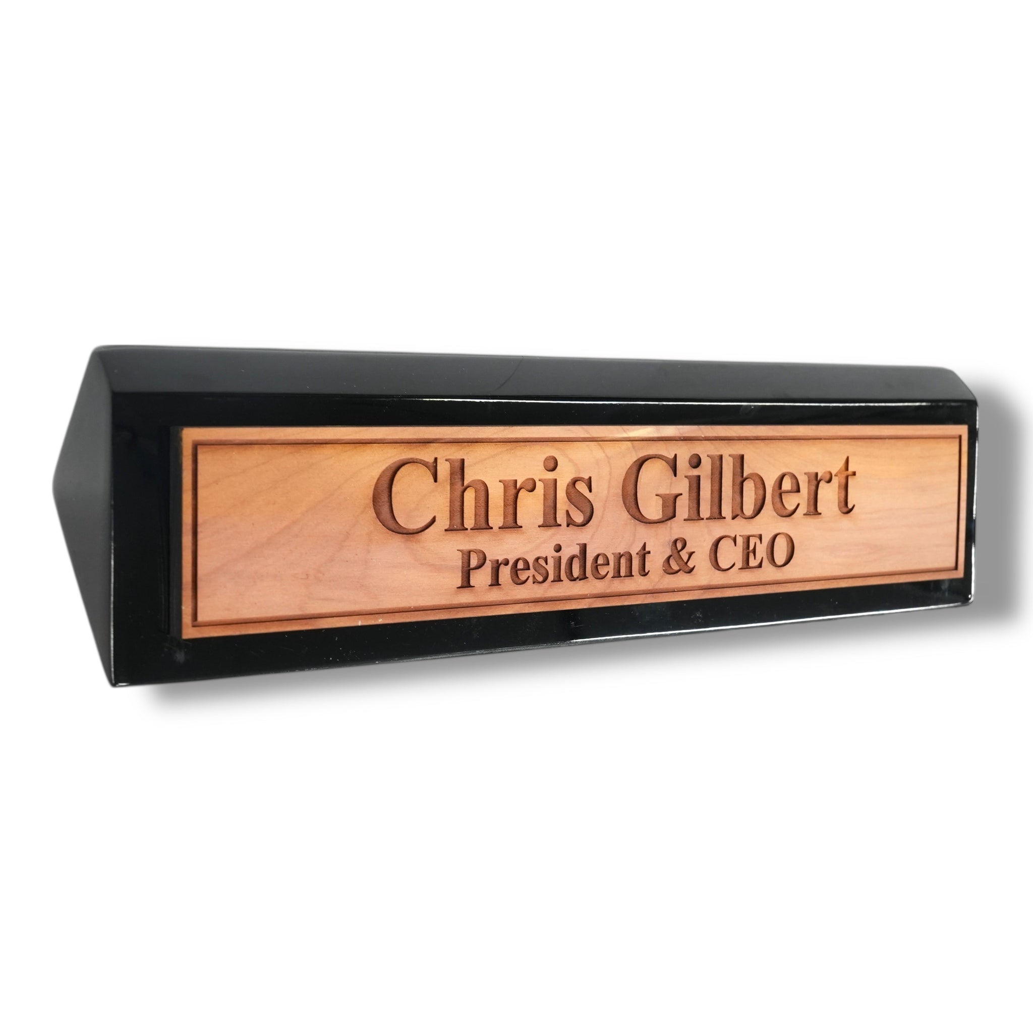 Our Desk Wedge CEDAR Name Plate combines personalized titles and styles with a sleek 11-inch length, available in black piano finish, rosewood piano finish, and solid walnut. Expertly crafted, its wedge design ensures optimal visibility and adds a sophisticated touch to any professional workspace. Made from high-quality materials, this name plate offers durability and elegance, making it an ideal choice for executives and professionals seeking a distinguished desk accessory.