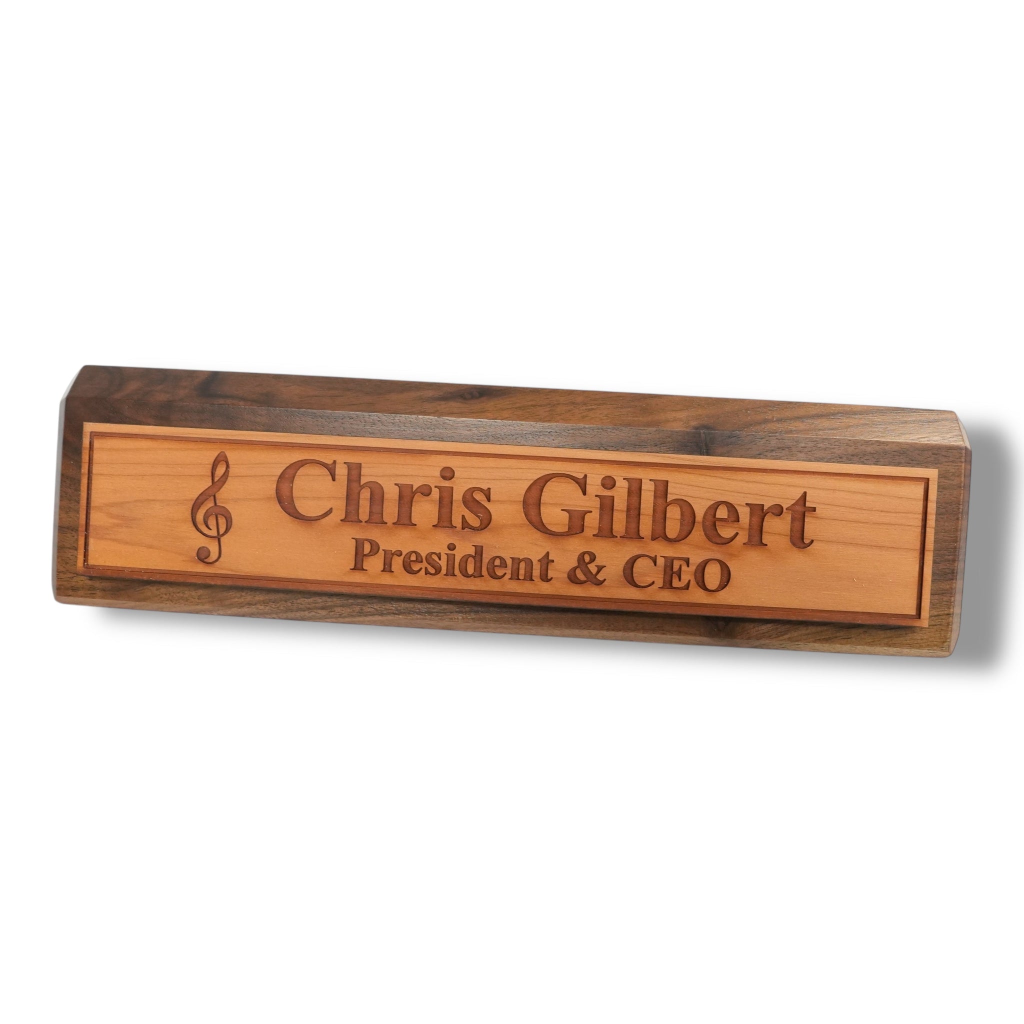 Our Desk Wedge CEDAR Name Plate combines personalized titles and styles with a sleek 11-inch length, available in black piano finish, rosewood piano finish, and solid walnut. Expertly crafted, its wedge design ensures optimal visibility and adds a sophisticated touch to any professional workspace. Made from high-quality materials, this name plate offers durability and elegance, making it an ideal choice for executives and professionals seeking a distinguished desk accessory.