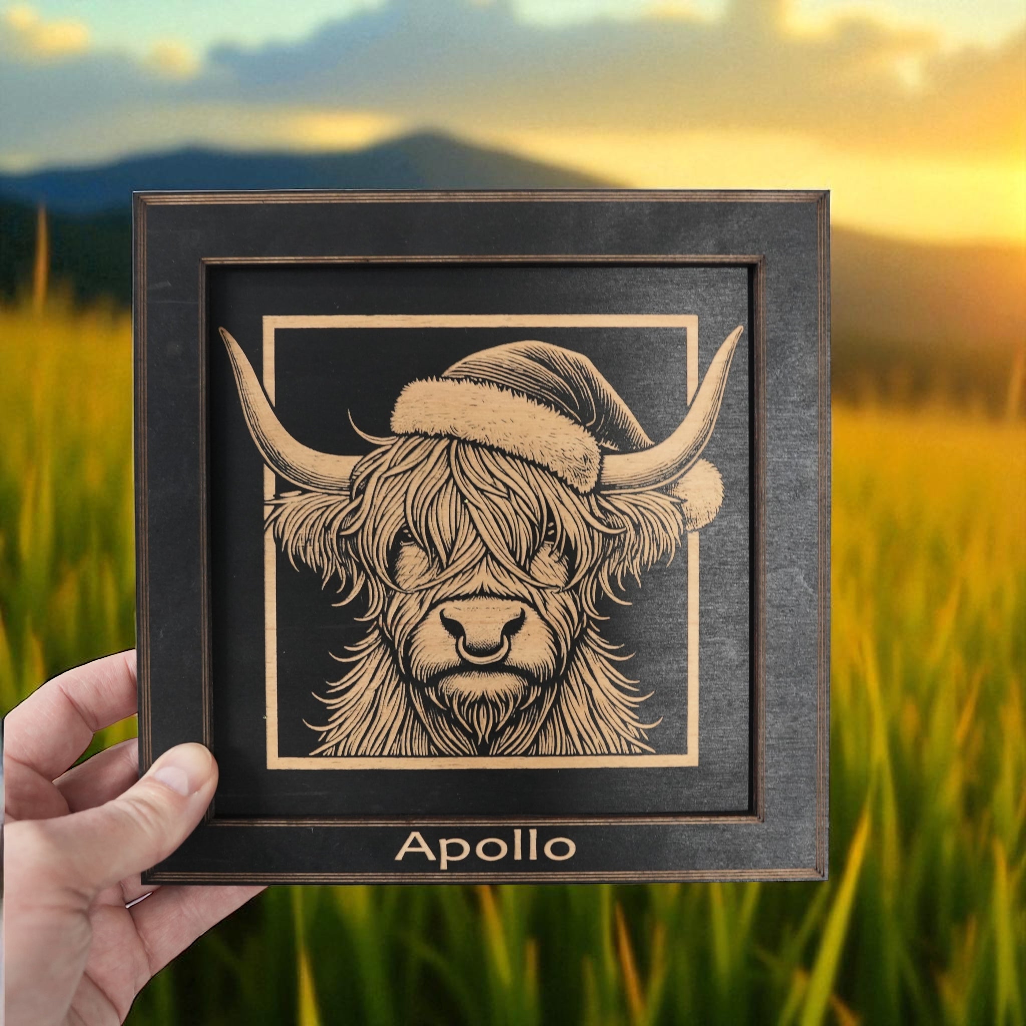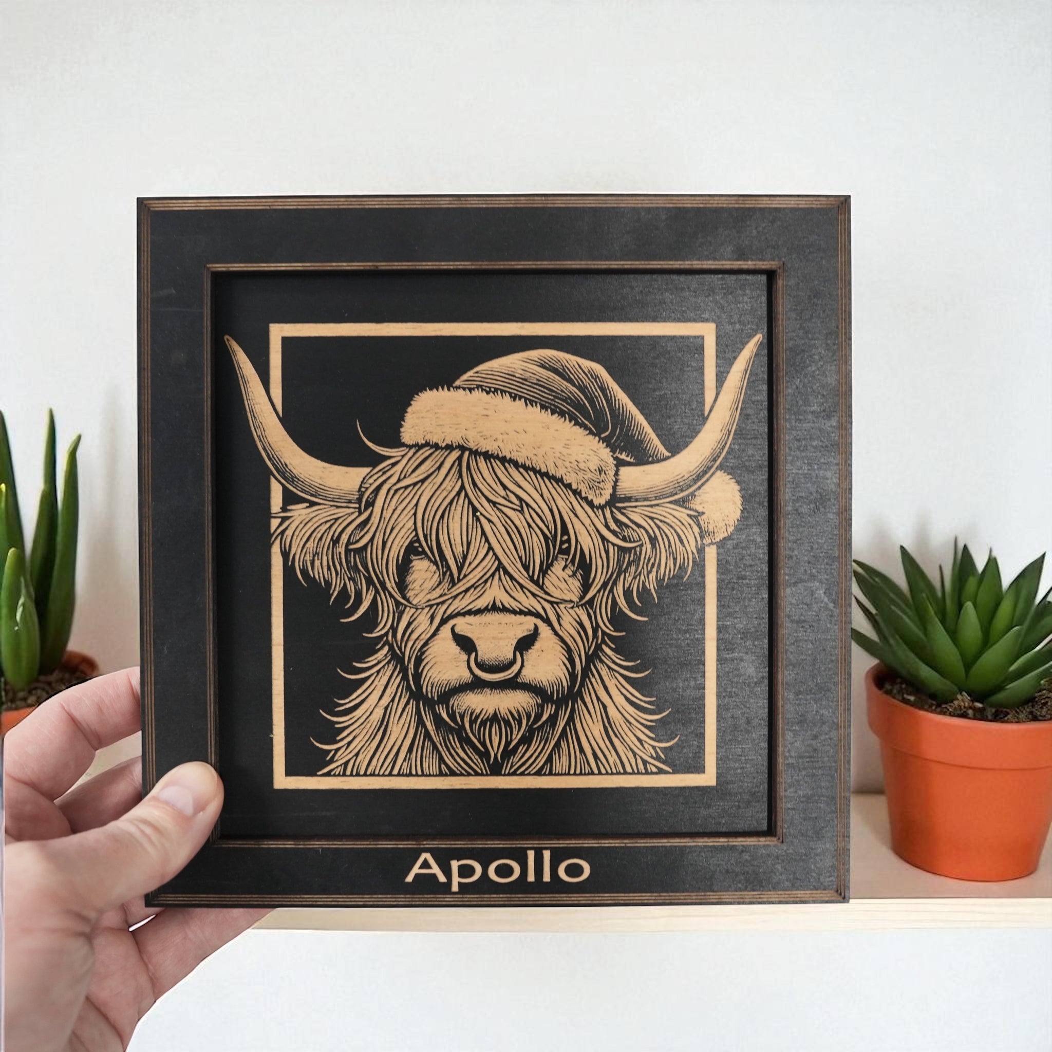 Framed Art - PERSONALIZED - CUSTOM - Highland Cow with Santa Hat