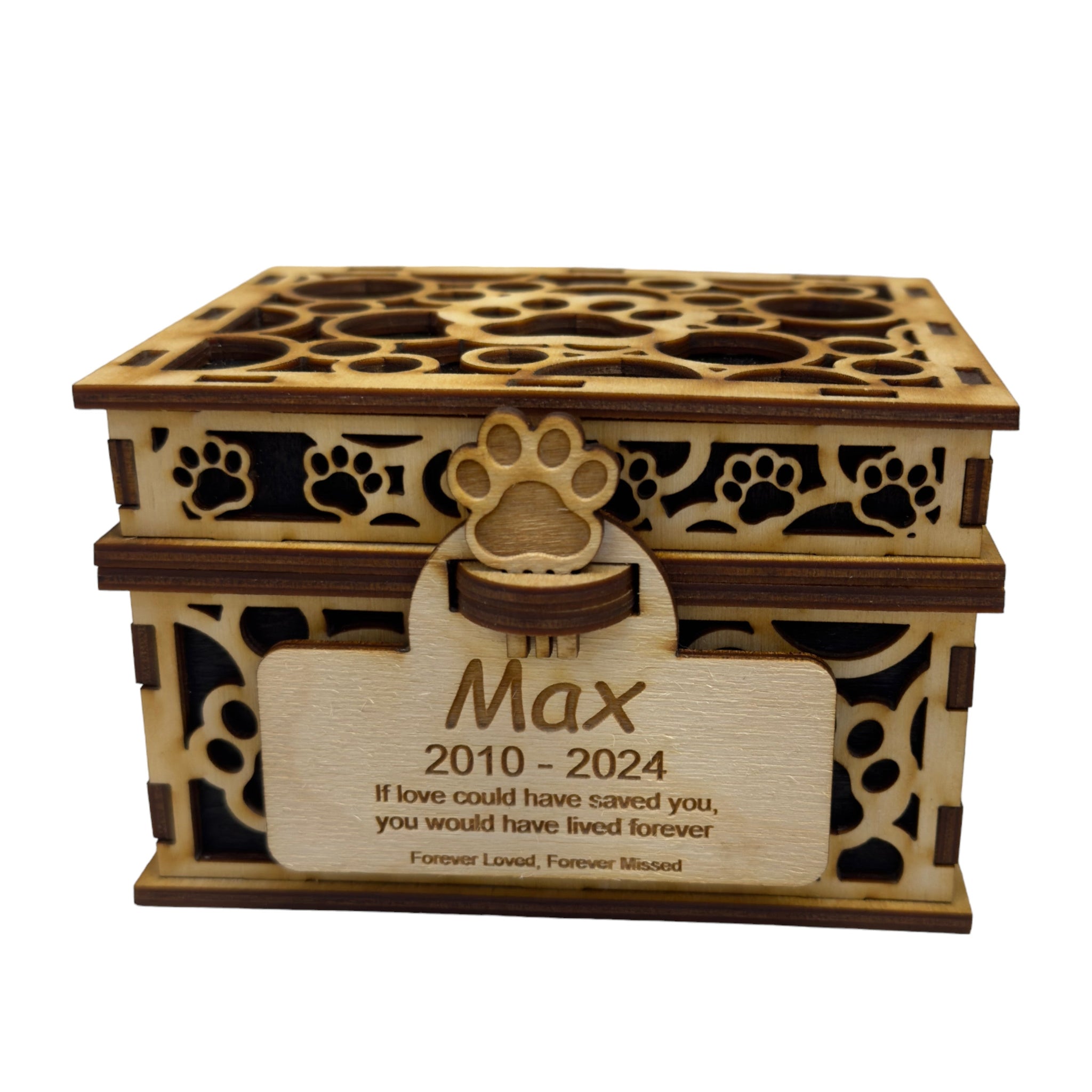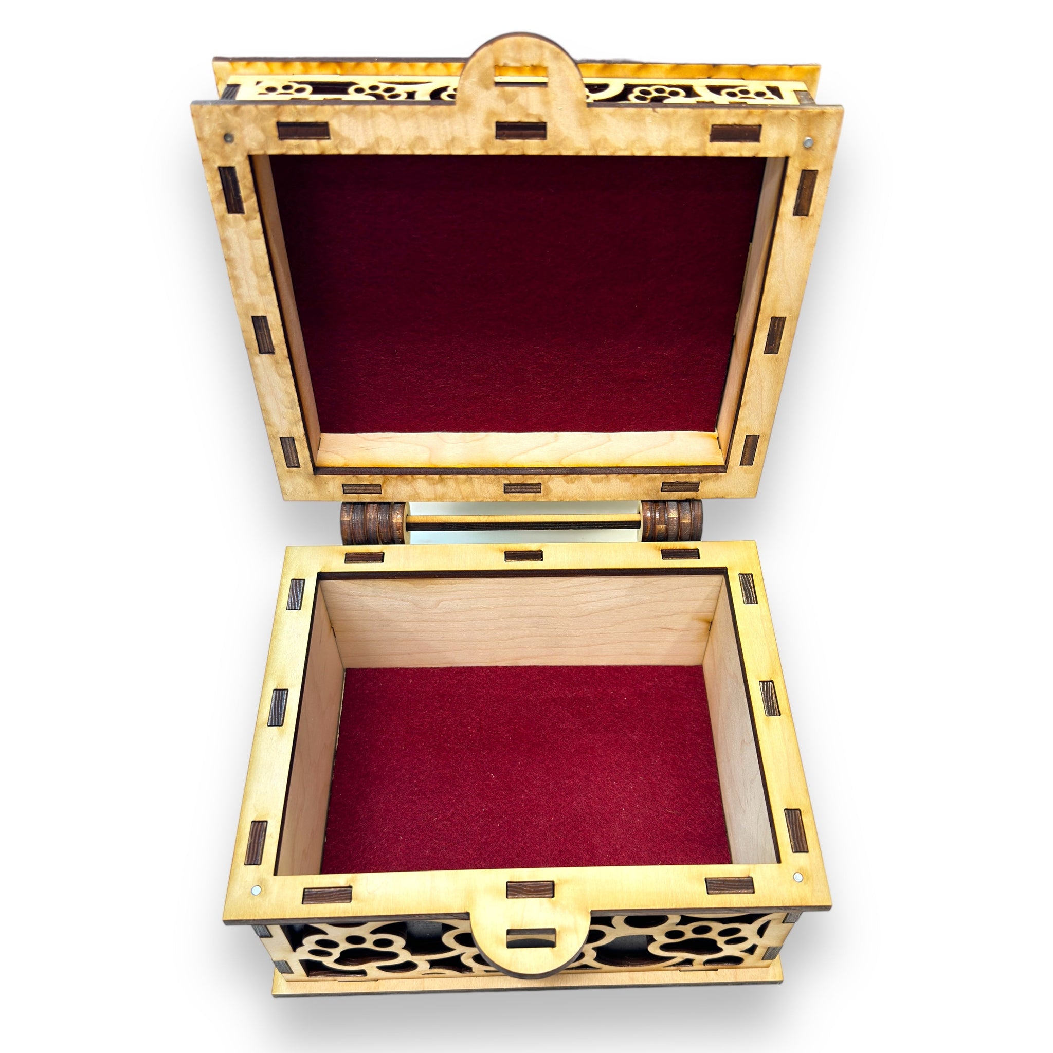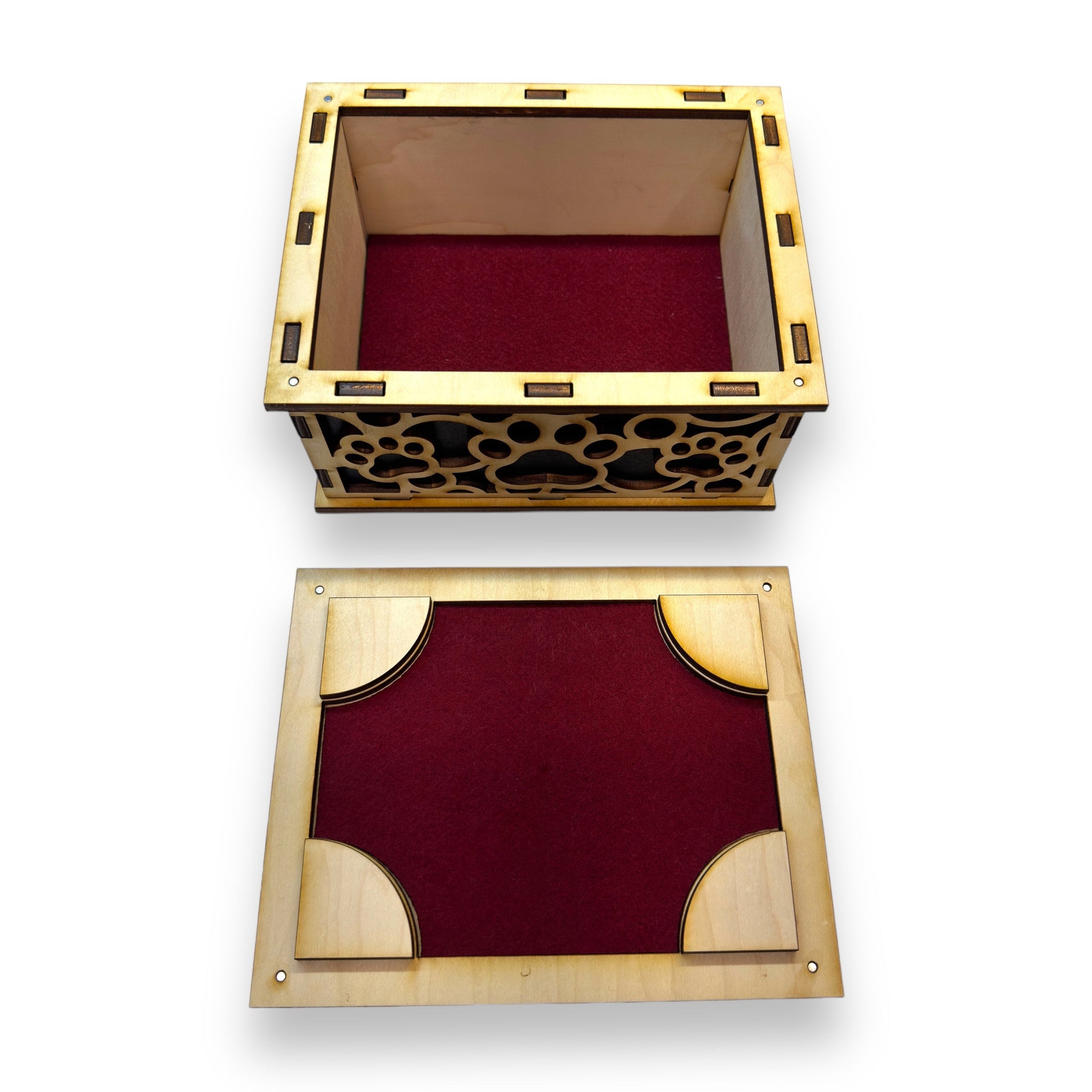The Paw Print pet urn is a beautiful and durable final resting place for your beloved pet. Handcrafted from birch wood, this hinged lid box provides a secure and personalized tribute. With a spacious inner compartment, this urn is perfect for honoring the memory of your furry friend.