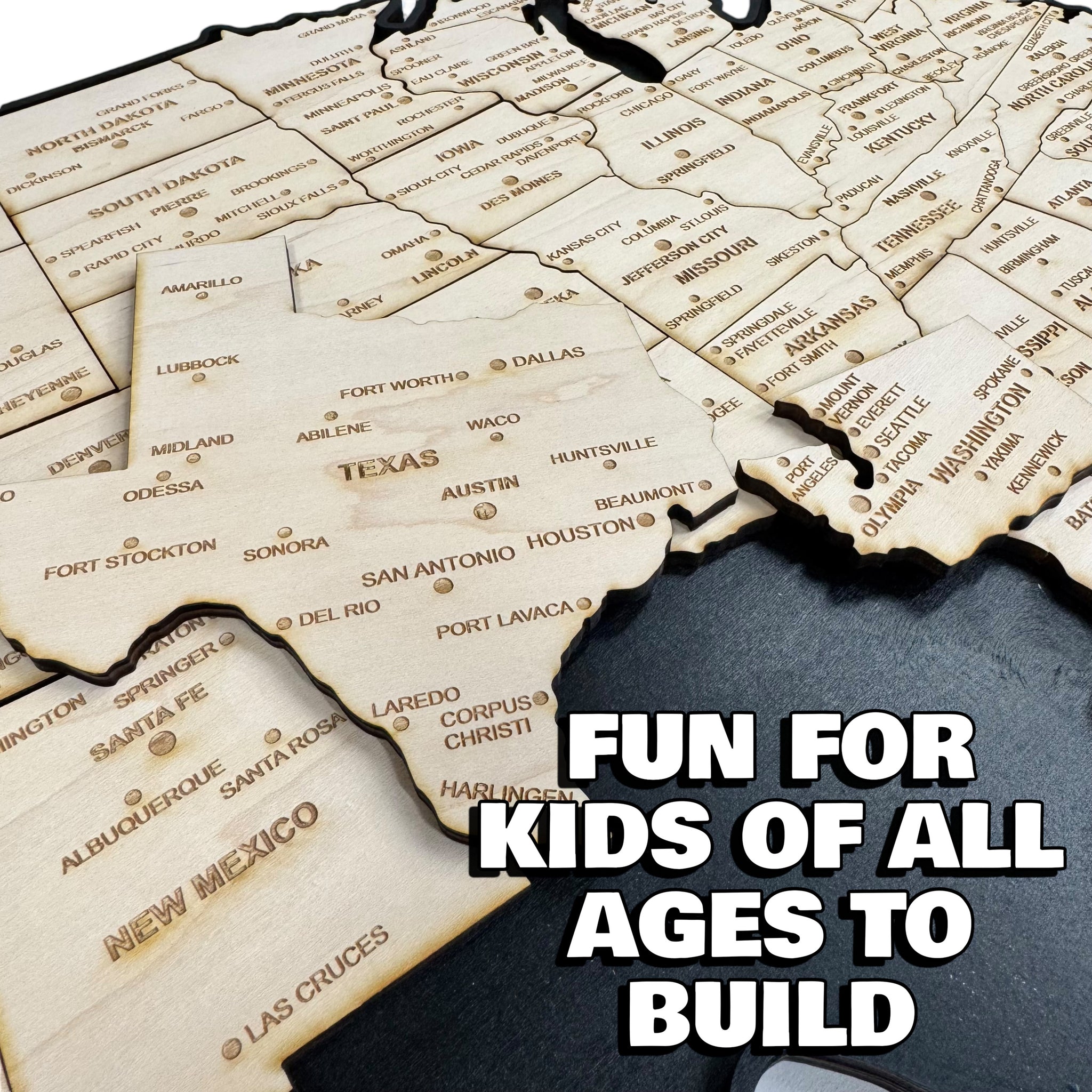 This 52-piece American puzzle map is a unique art kit designed for DIY enthusiasts and creative minds. Made from raw wood and laser-cut in Texas, each piece is 1/4" thick, providing a sturdy and high-quality base for painting, staining, or any other customizations you envision.