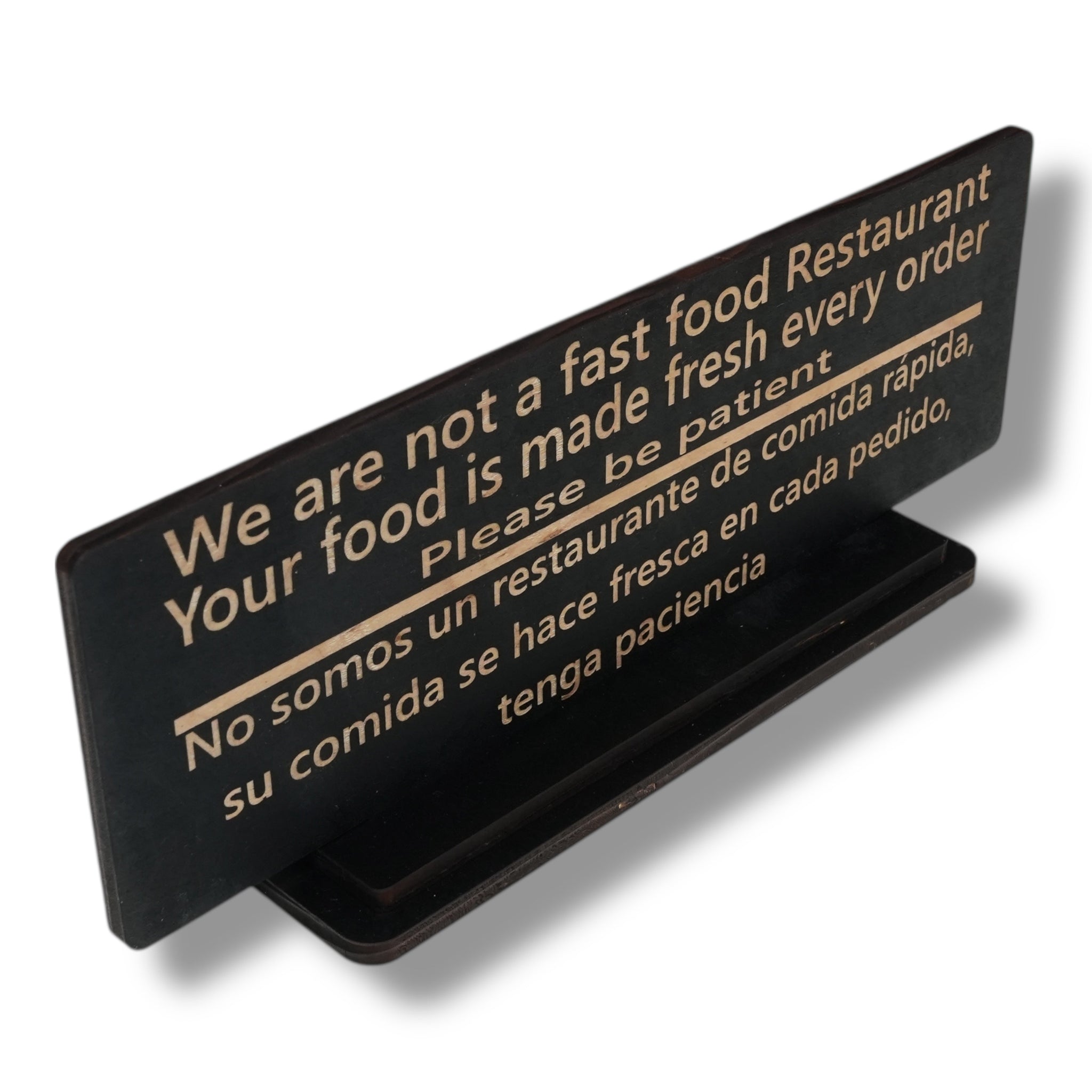 Sign - English & Spanish - With STAND - We are not a fast food restaurant Please Be Patient - 10x4 Inches